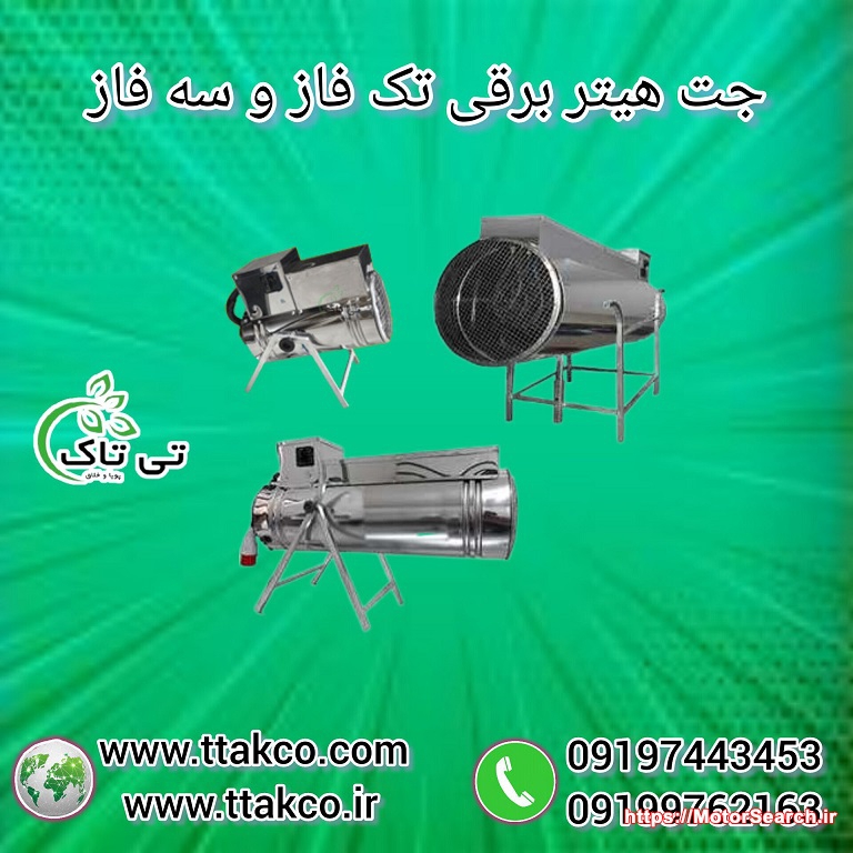 جت هیتربرقی مرغداری: گرمایش در صنعت دام طیور بخصوص در سالن مرغداری باید ویژه در نظر گرفته شود، در مرغداری مرغ های گوشتی و تخم گذار و سالن جوجه یک روز الی سه ماهه انتخاب یک دستگاه گرمایشی (برای تنظیم دمای محیط و در عین حال عدم تولید آلایندگی) بسیار مهم است.
